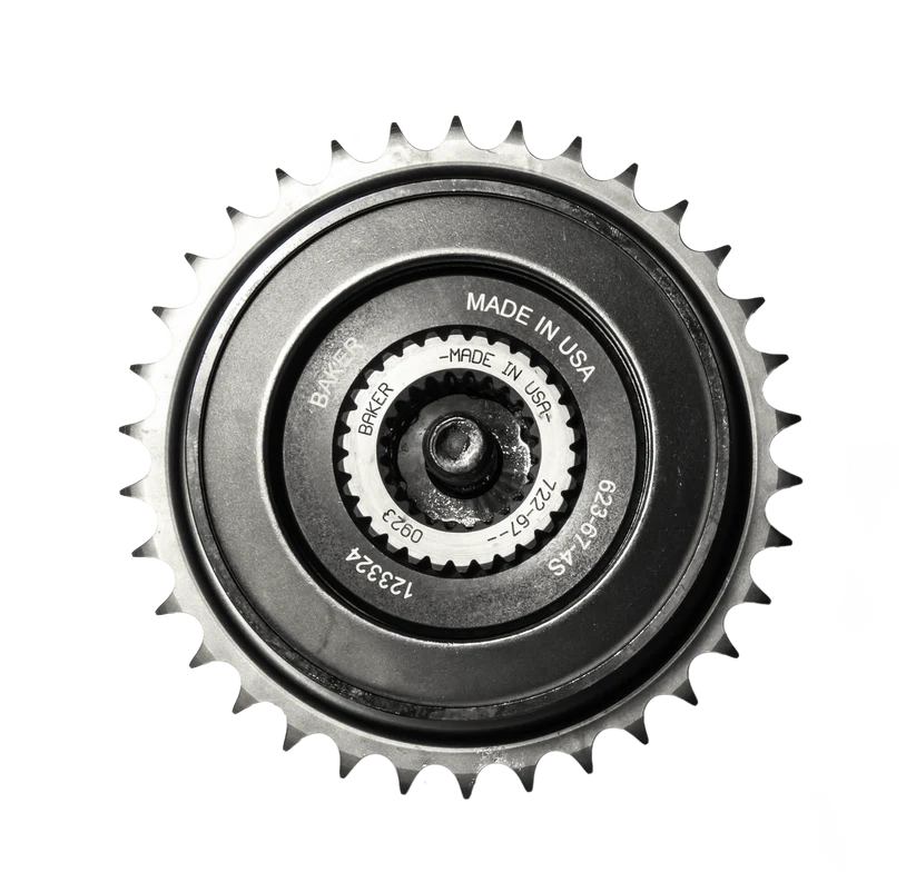 BAKER Drivetrain unveils the final solution to the late model compensator problems. The BAKER Drivetrain compensator sprocket is engineered with an annular oil distribution system that scavenges primary oil and pumps it with centrifugal force to all radial and axial thrust surfaces. English translation: This sprocket delivers quiet operation, relentless durability, and refined function to smooth out the inherent power pulsations of the second-generation Twin Cam and M8 motors.